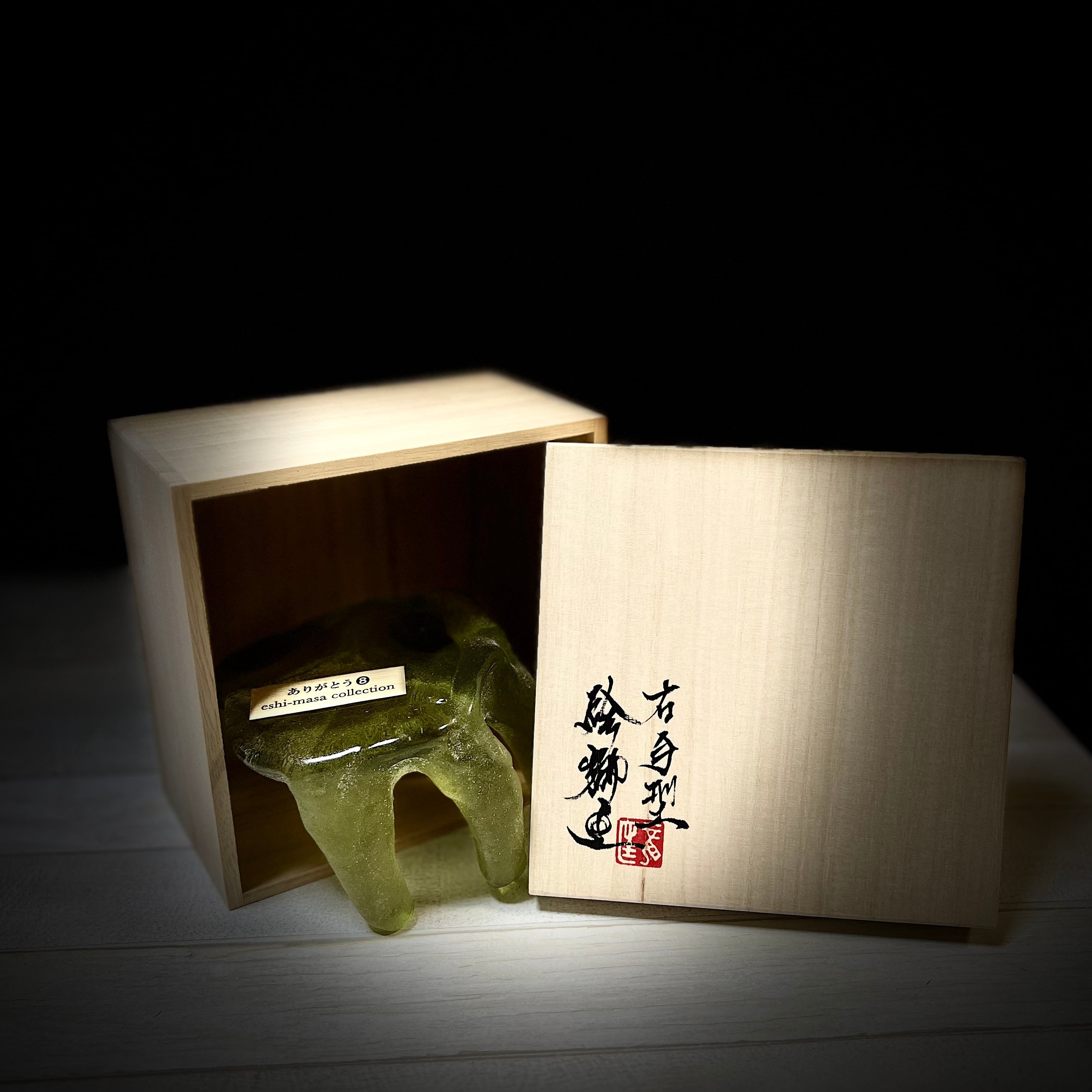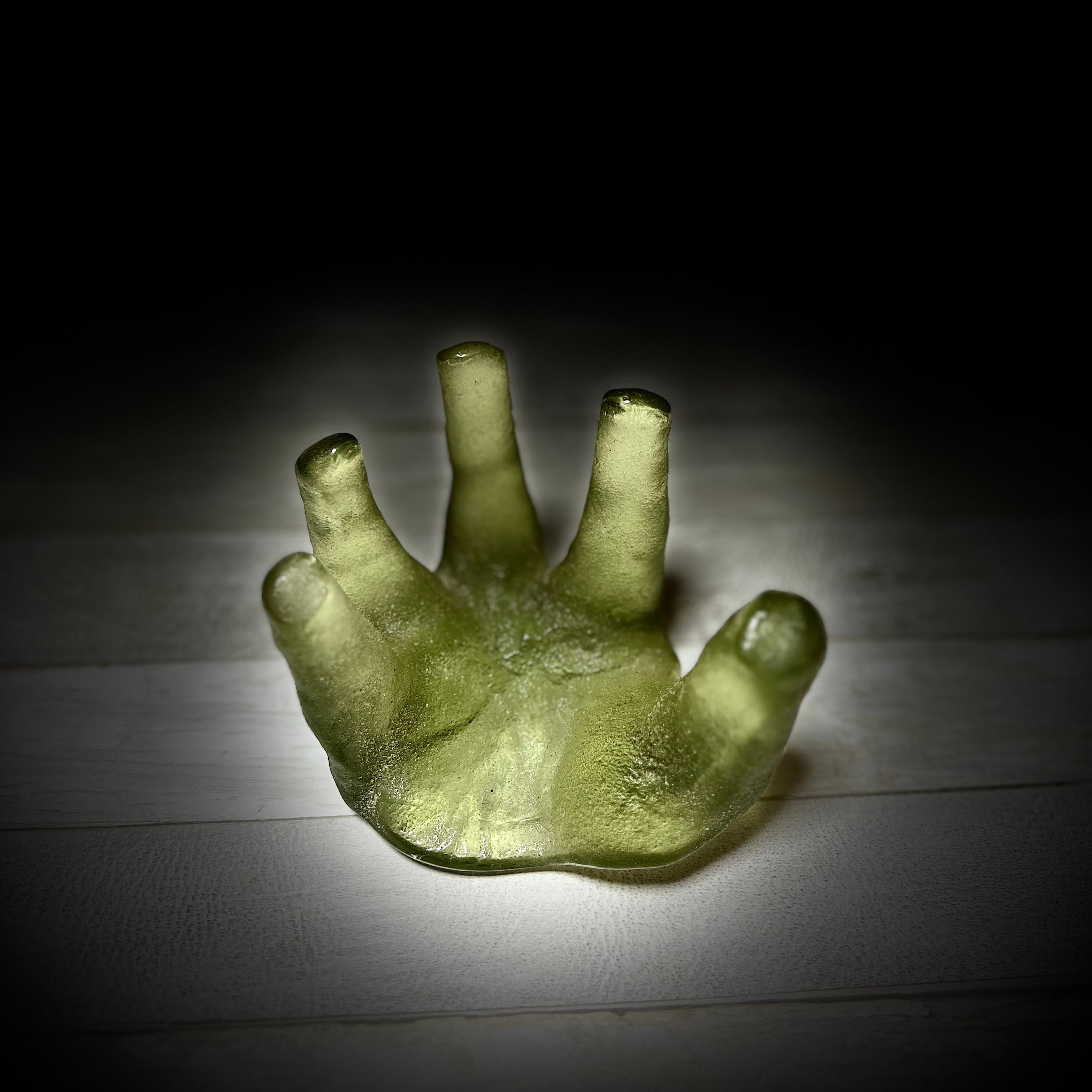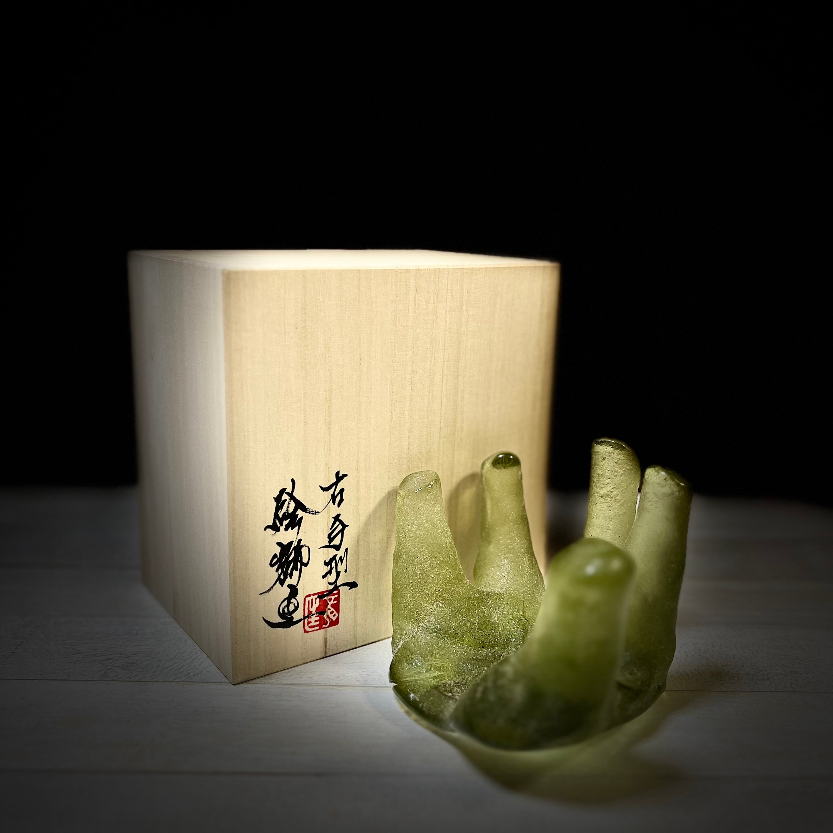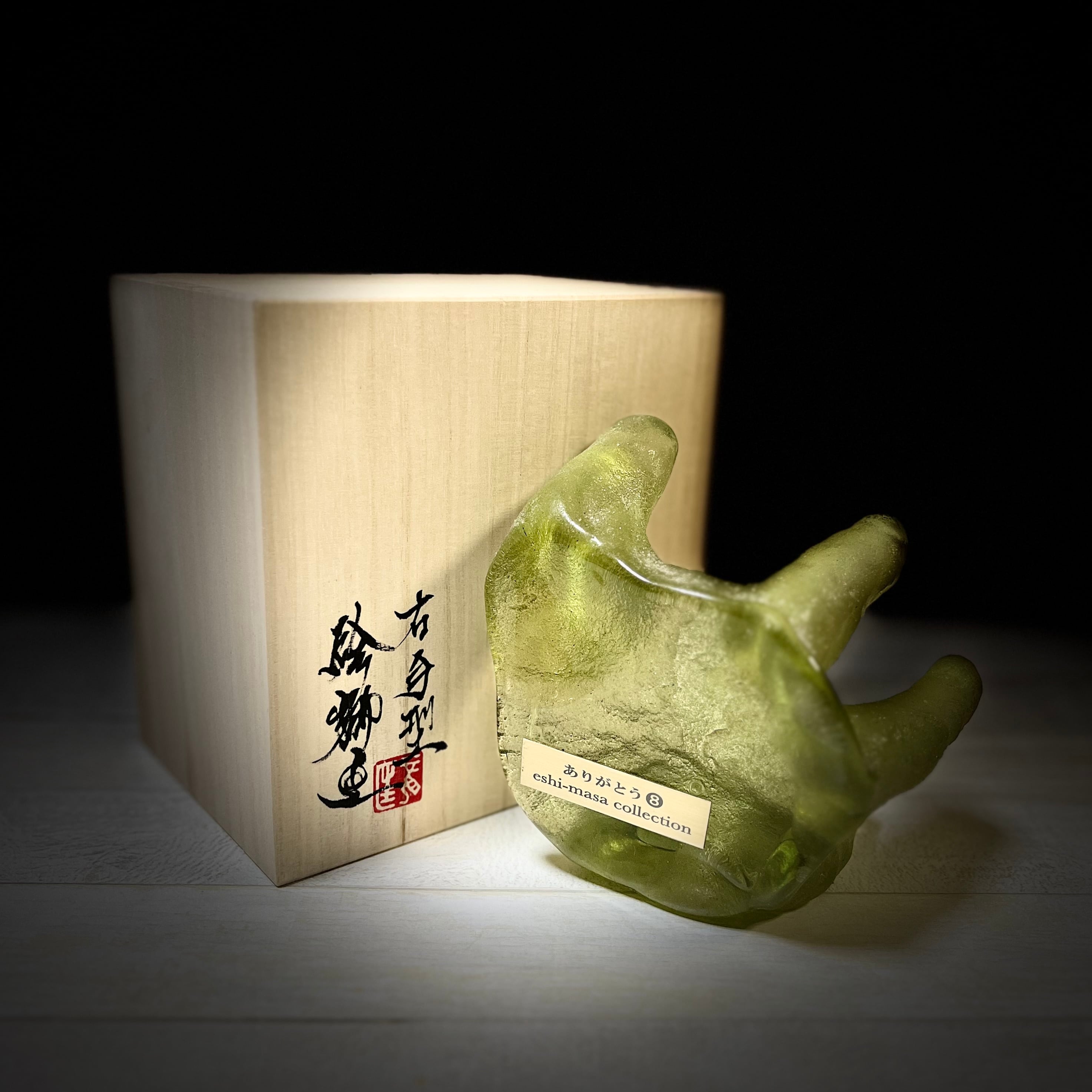 ・新島ガラス特有のオリーブグリーンの持つ色彩の美しさと透明感とが融合し、手形のディテールが心に響きます。このアート作品は、ただの装飾品ではなく、持つ人にインスピレーションを与える特別な存在です。 右手型取りのデザインは、数々の作品を生み出した手から発せられるエネルギーを表現しています。