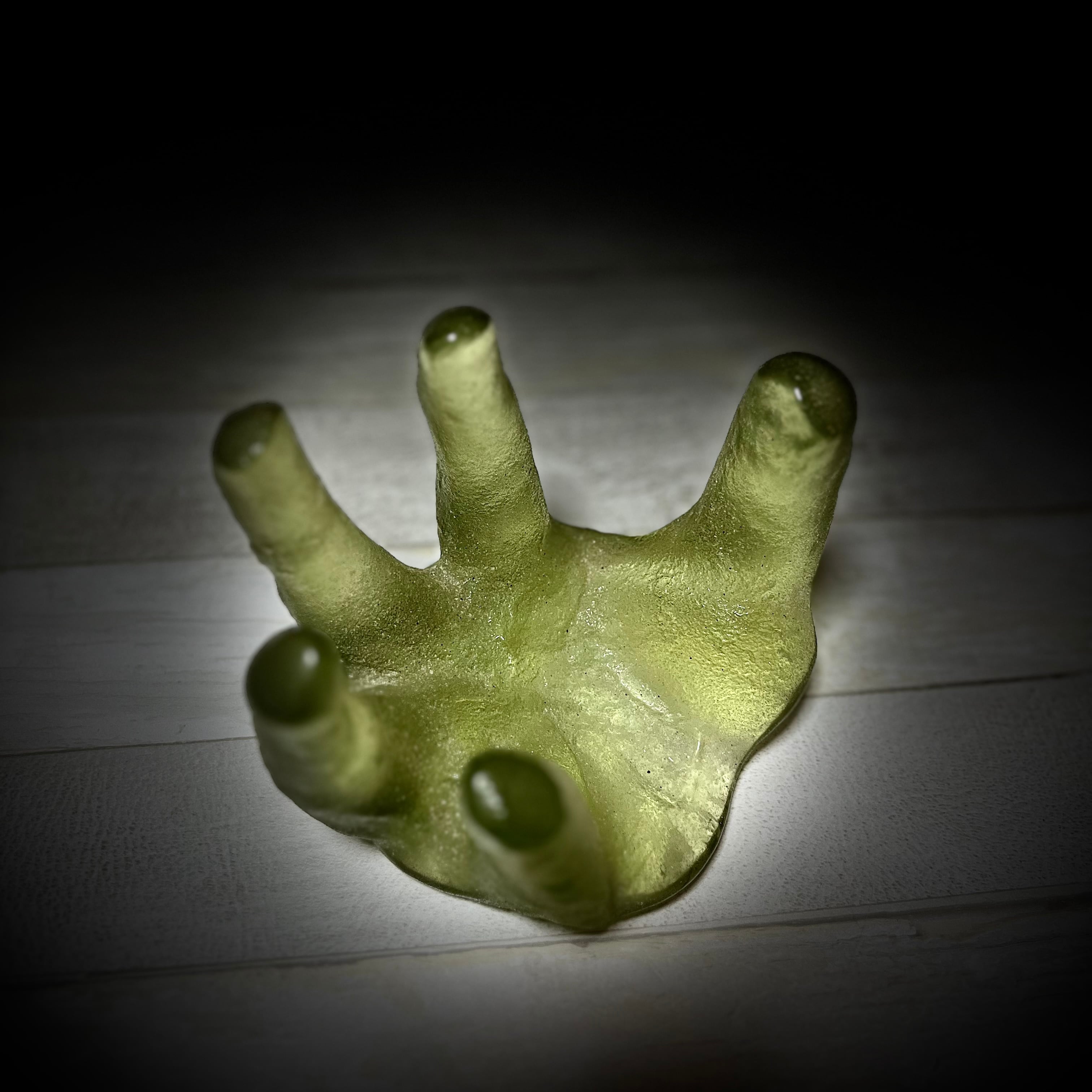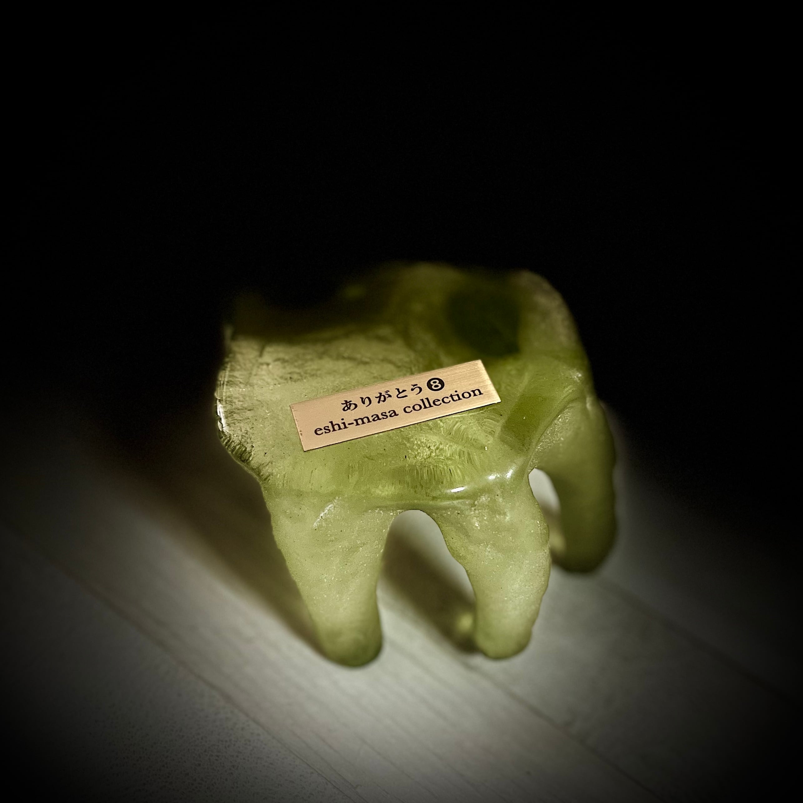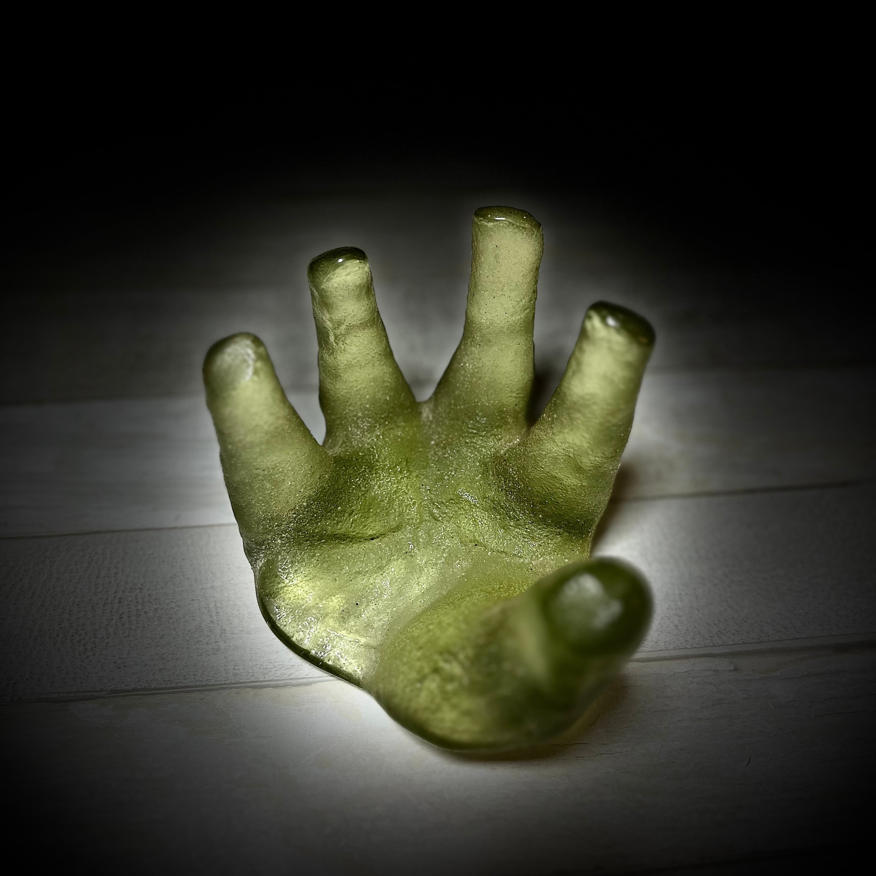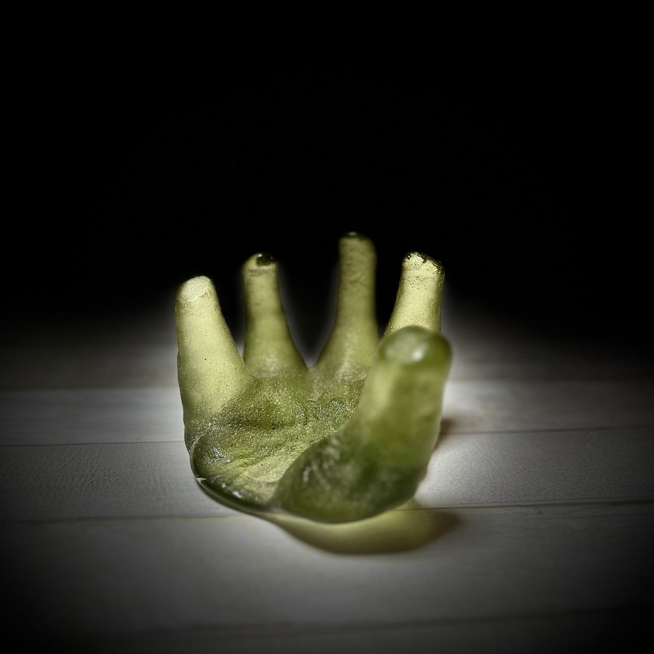 ・新島ガラス特有のオリーブグリーンの持つ色彩の美しさと透明感とが融合し、手形のディテールが心に響きます。このアート作品は、ただの装飾品ではなく、持つ人にインスピレーションを与える特別な存在です。 右手型取りのデザインは、数々の作品を生み出した手から発せられるエネルギーを表現しています。